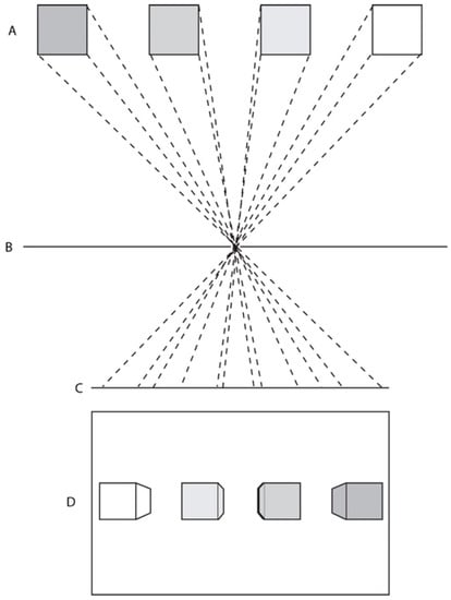 Linear perspective is a geometrical method of modelling the behavior of light as it travels through a small aperture in a barrier to be projected onto a (normally) flat surface. It exploits the fact that light rays travel in straight lines while the aperture permits only a relatively small number of all the available rays in the environment to reach the projection surface (see Figure 1). In the case of a camera obscura or pinhole camera this results in an inverted image on the light receiving plate. Linear perspective geometry can emulate this process using construction lines that converge at a single vanishing point, in the case of one-point perspective, and some simple mathematics to determine the diminution of objects as they recede in pictorial space. Many writers have since argued that linear perspective is the only correct way to depict visual space because, properly arranged and viewed, a linear perspective image will present the single eye with an identical pattern of light to that arriving from the real scene being depicted [8,9,10,11,12,13].