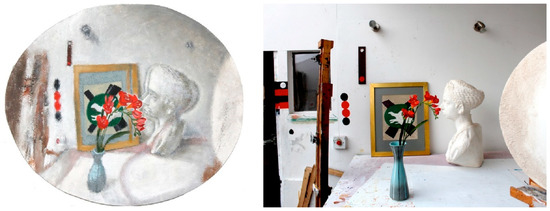 (Left) Still life with objects, Robert Pepperell, oil and sand on shaped canvas, 2012. (Right) Linear perspective photograph of same physical space depicted in the painting showing approximately the same visual space but taken from a point of view further back than that from which it was painted. Note the relative enlargement of the centrally located objects, the diminution of objects in the periphery of the painting compared to the photograph, as well as the binocular doubling in the area behind the flowers and the fall of in acuity with eccentricity.