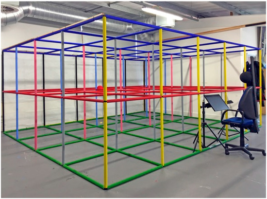 To carry out our experiments we constructed a three-dimensional visual scene (3D grid room) composed of intersecting metal rods, each 100 cm in length, arranged as a three-dimensional grid of cubes each 100 cm3 and stacked in a grid 5 cubes wide by 4 cubes deep by 2 cubes high. See Figure 4. The rods were covered in colored insulation foam, which allowed for easier visual discrimination of the different layers when viewing inside the grid. A polystyrene sphere 20 cm in diameter was suspended within the center of the furthest cube, 350 cm away from the frontal view of the observer, at a height of 100 cm from the ground and subtended 3.27° of visual angle. Using this sphere as the fixation point, one of the authors then made a line drawing of the entire visual space using Adobe Illustrator on a 15-inch Apple Macintosh laptop using the natural perspective principles outlined above. The drawing is shown in Figure 5.