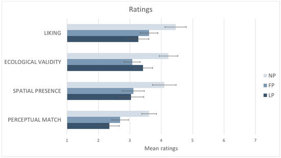 Results from the questionnaire are summarized in Figure 7. Results showed that there was a statistically significant difference between liking ratings participants gave to the three different photographs as determined by one-way ANOVA: F (2,50) = 8.770, p < 0.001. Post hoc tests using the Bonferroni correction revealed that the mean ratings obtained by the NP (M = 4.46, SD = ±1.2) were statistically significantly higher compared to the ones obtained by the FP (M = 3.61, SD = ±1.36; p < 0.025) and the LP (M = 3.26, SD = ±1.63; p < 0.025). The NP was judged as having statistically significantly more spatial presence than the other photographs as determined by one-way ANOVA: F (2,50) = 6.982, p < 0.05. Post hoc tests using the Bonferroni correction revealed that the mean rating obtained by the NP (M = 4.09, SD = ±1.51) was statistically significantly higher compared to the ones obtained by the FP (M = 3.11, SD = ±1.29; p < 0.025) and the LP (M = 3.04, SD = ±1.55; p < 0.025).