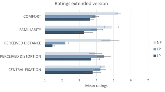 The graph reports the average ratings from the extended version of the questionnaire (N = 16) on a 7-point Likert scale for each photograph: Natural (NP), Fisheye (FP) and Linear (LP). Standard errors are represented in the figure by the error bars attached to each column.