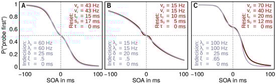 (A) for many cases, the two models predict similar “probe first” curves, though assuming different values for the rate parameters; (B) the encoding reset model can produce shallow overall curves with a crisp plateau. For the indecision range model, the dispersion of the plateau is always similar to that of the curve in general, producing no noticeable plateaus for shallow curves like this one; (C) the vertical plateau position can shift independently of the processing rate in the indecision range model. In this example, both rates are equal (). By contrast, in the encoding reset model, a similar vertically shifted plateau can only be achieved by a difference in the processing rates ( shifts the plateau upwards as in this example). Note that the weaker reference rate results in a more shallow curve at the positive stimulus onset asynchronies (SOA). An interactive demonstration can be found at [30].