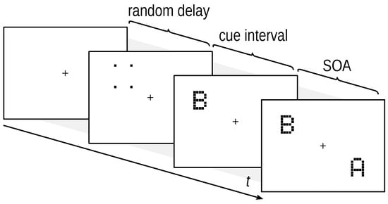 The stimuli were temporally separated by the SOA (stimulus onset asynchrony), which varied from −100 to 100 ms. At negative SOAs, the probe stimulus was shown first. Subsequently, the reference stimulus was presented. At positive SOAs, the reference stimulus led and was followed by the probe. In cued TOJs, the probe is the one preceded by the cue per definition. Hence, Figure 2 depicts a cued TOJ trial with a negative SOA. In neutral conditions, the probe–reference assignment is arbitrary. Note that we also included an SOA of zero, at which both stimuli were shown simultaneously.