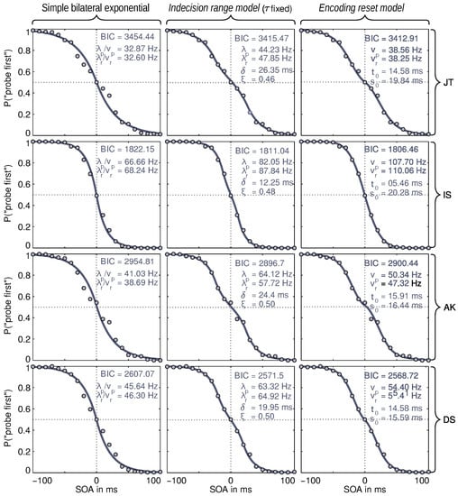 The data was fitted on the subject level with a modified (to account for the new models) version of Alcalá-Quintana and García-Pérez’s [13] framework. The evaluation included the TVA-based encoding reset model and the indecision range model. The indecision range model was used without error parameters. Additionally, the parameter (which is responsible for the plateau position on the x-axis) was fixed at zero. Omission of these two parameters ensured that both models have the same complexity with four parameters (see second and third column of Figure 3). These parameters were not relevant because the parameter is not expected to vary in a simple visual TOJ, and the error parameter is not necessary because the participants were highly trained during the experiment. A third model based on a simple bilateral exponential distribution of the arrival times was included to provide a comparison with a model without a plateau-generating mechanism. This simple model is a special case of both the TVA-based encoding reset model and the indecision range model.