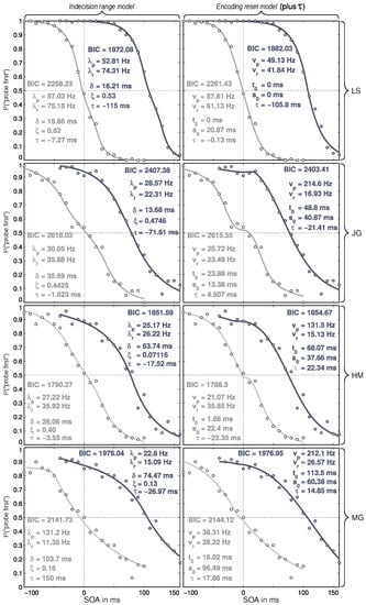 Interestingly, the pattern of processing speeds (v and ) differs a bit between the two models: For three participants, the encoding reset model’s estimates are about 10 Hz lower; for IS, the difference is the other way around and double in size. This difference is interesting because both v and are processing speed parameters and thus should result in a similar pattern. A difference of 10 Hz is neither critically large nor negligible. (In the passing, it may be noted that the model without plateau-generating mechanism yields much smaller rates. This is because it has to lower the rates in order to approximate the more shallow slope in the center of the psychometric distributions.)