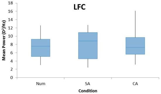 Box plots demonstrating the mean power of FFTs for the LFC (top), MFC (middle), and HFC (bottom) for all participants for the conditions Num, SA, and CA. A repeated measures ANOVA with Bonferroni post-hoc analysis found a significant effect for HFC with a significant difference between CA and SA and CA and Num conditions. No significant effect was found for LFC or MFC.