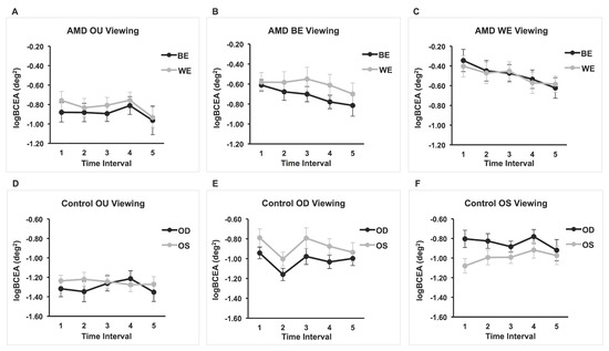 Mean logBCEA for five 3-second intervals for AMD and control groups under binocular and monocular viewing conditions. Fixation stability of both covered and viewing eyes are plotted for each viewing condition. (A) n = 17; (B) n = 16; (C) n = 15; (D) n = 17; (E) n = 16; (F) n = 17.