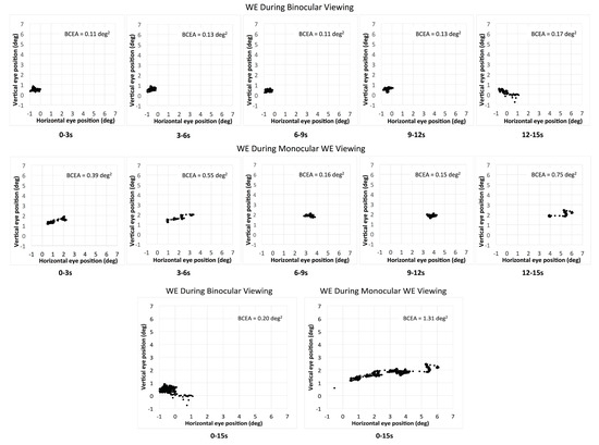 We have previously suggested that fixation examination with the MP-1 microperimeter could be shortened to a 5 s test, since fixation stability does not change with the passage of time [21]. The current study extends the recommendations to binocular viewing and monocular viewing with the BE recorded with an eye-tracker. For the WE however, fixation duration should depend on whether the goal of the examination is to determine fixation stability (i.e., variability of eye position during the task) or to determine the PRL location. For some patients—especially those with large interocular acuity differences—longer fixation examinations may reveal an inflated BCEA caused by a change in PRL location rather than by a large variability in eye position around a single PRL (see Figure 2).