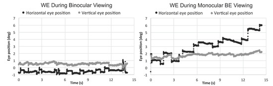 Horizontal and vertical eye position of the WE (worse eye) during binocular and monocular WE viewing for the 15s fixation period.