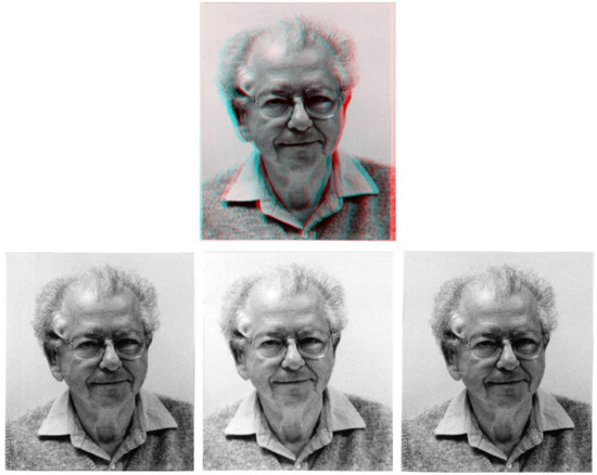 Stereoscopic photograph of Bela Julesz. The photographs were taken in the late 1990s by TVP and KM. The left and right eye views are from two locations separated by slightly more than the average interocular distance. Upper: An anaglyph in which the proper depth configuration can be seen with red/cyan glasses (red/cyan filter in front of the left/right eye, respectively). Lower: Left eye, right eye and left eye members of the stereoscopic pairs. There are two ways to fuse the two stereo sets of photographs so as to obtain the proper depth configuration, i.e., a natural face: to cross-fuse the right pair, or to uncross-fuse the left pair. A pseudoscopic pairing can be seen with the anaglyph by reversing the glasses (cyan/red filter in front of the left/right eye) or by swapping the left- and right-eye images for the bottom panel: i.e., either cross-fuse the left pair, or uncross-fuse the right pair; this has the effect of reversing the signs of the binocular disparities.