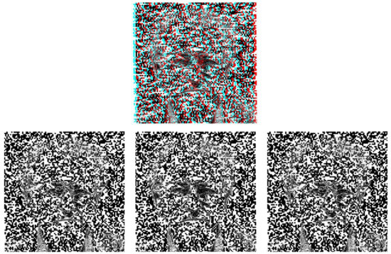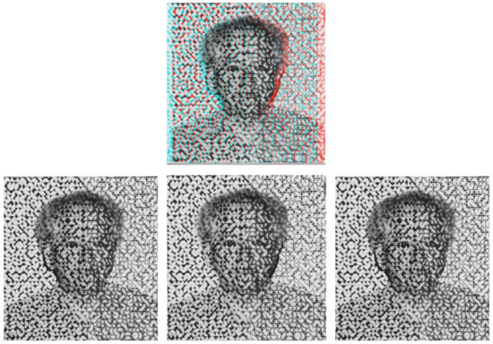 Random-dot stereoscopist. Stereo ‘perceptual portrait’ of Bela Julesz, based on the stereoscopic photograph shown in Figure 1, embedded in a random-dot pattern. Upper: An anaglyph which can be seen in depth with red/cyan glasses. Lower: Left-, right- and left-eye members of the stereoscopic pairs. The modes for proper and pseudoscopic depth viewing are the same as in Figure 1.