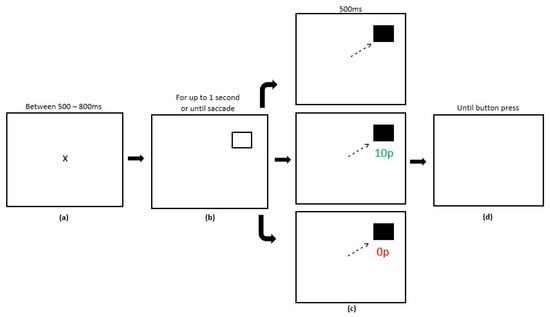 Sequence of events in the reward paradigm (adapted from Dunne et al., 2015 [31]; not to scale). (a) Participants were presented with a fixation cross for a variable time (500–800 ms). (b) The saccade goal was indicated by the appearance of a hollow square displayed for up to 1000 ms or until a saccade was made. (c) After a successful saccade or 1000 ms, participants received visual feedback in the colour change of the target stimulus. In the conditioning phase, when the target appeared at the rewarded location, successful saccades yielded a reward of 10 p on 60% of trials (Panel 2). No rewards were available when the target appeared at the unrewarded location, indicated by the presence of ‘0 p’. In the post-conditioning phase, no reward was available (Panel 3). Feedback was presented for 500 ms. (d) After a saccade towards the target, the trial ended and participants were required to press a button to start the next trial.