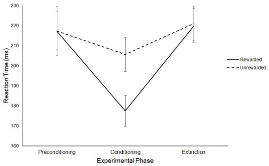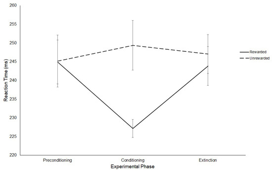 Three paired sample t-tests were conducted on the latency of saccades for the rewarded and unrewarded hemifields at each level of Experimental Phase. No significant differences were found between the latencies of saccades to the rewarded (M = 217 ms, SD = 42.27) or unrewarded hemifield (M = 217 ms, SD = 32.79) in the preconditioning phase (t(11) = −0.02, p = > 0.017, g = 0.005). A significant difference was found between the latencies of saccades to the rewarded (M = 177ms, SD = 27.06) and unrewarded (M = 206 ms, SD = 29.79) hemifields in the conditioning phase (t(11) = −2.99, p = < 0.017, g = 0.987), such that participants produced significantly faster SRTs towards the rewarded hemifield. No significant differences were found between the saccadic latencies in the rewarded (M = 220 ms, SD = 29.05) and unrewarded (M = 221 ms, SD = 29.55) hemifields for the extinction phase (t(11) = −0.20, p = > 0.017, g = 0.037). Figure 6 illustrates this result.