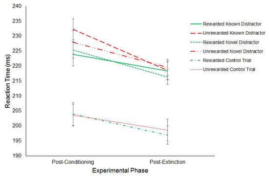 Latency of rewarded and unrewarded distractor trials across the post-conditioning and post-extinction phases of the remote distractor task in Experiment 1. Error bars show +/−1 SEM.