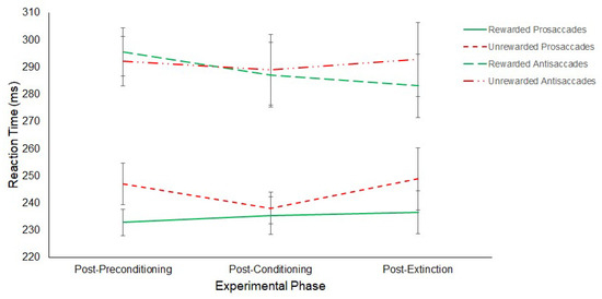 A 3 (Experimental Phase: Post-Preconditioning/Post-Conditioning/Post-Extinction) × 2 (Saccade: Antisaccade/Prosaccade) × 2 (Hemifield: Rewarded/Unrewarded) repeated-measures ANOVA on SRTs revealed a main effect of Saccade (F(1,11) = 21.44, p ≤ 0.01, η2 = 0.661) with prosaccades (M = 240 ms, SD = 19.01) being significantly faster than antisaccades (M = 290 ms, SD = 33.36).