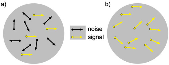 Schematic examples of global motion coherence tasks; both schematics represent dots in motion. An observer would be required to make a left/right response based on his/her perceived direction of motion. Black dots represent noise dots, and yellow dots with a black border represent signal dots. The arrows represent the direction of motion of the dots. (a) is a typical stimulus comprised of signal dots and noise dots (approximately 30% coherence). This task requires the observer to segregate and ignore the noise and report the signal direction. (b) An equivalent noise stimulus where all dots contribute equally to the signal and the noise (drawn from a distribution of approximately 90° out of a possible 360°). In this task, there are no explicitly designated signal dots, and the direction decision requires the observer to integrate all of the dots to infer the mean direction. In each case, the correct response would be that the dots are moving rightwards.
