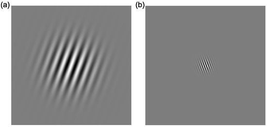 Figure 4. Example of Gabor gratings used for contrast detection for stimuli with (a) 1 cycle per degree at +20° (b) and 4 cycles per degree at −20°.
