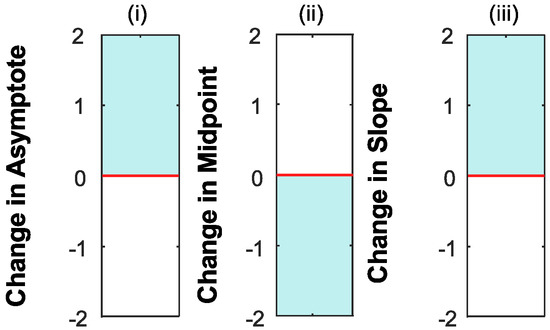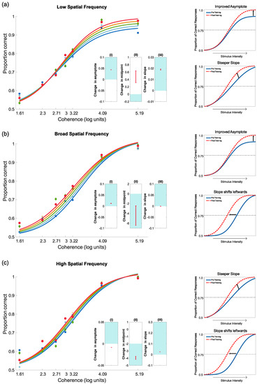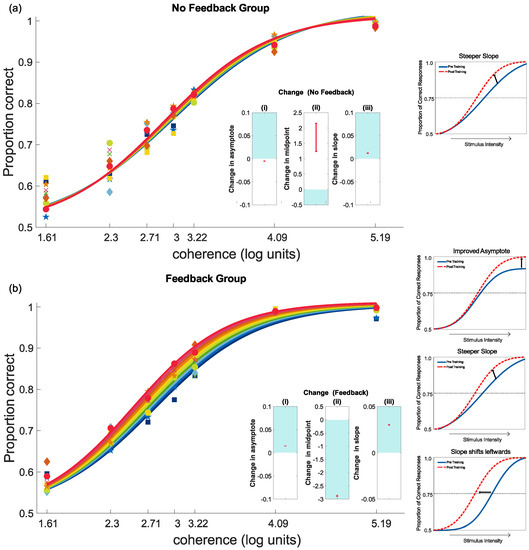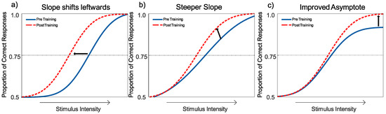 Learning is often measured through monitoring performance at a particular threshold, which is expected to shift the psychometric function leftwards if performance is improved; see Figure 5a. This threshold describes a change in performance (proportion correct) as a function of the strength of the stimulus [92]. The leftward shift in the curve indicates an improvement in threshold (or the midpoint). However, learning may differ across stimulus intensities. For example, an increase in slope indicates an increase in the rate at which performance increases with increasing stimulus intensity (see Figure 5b). The GLMM can fit these two types of learning within its two free parameter model.