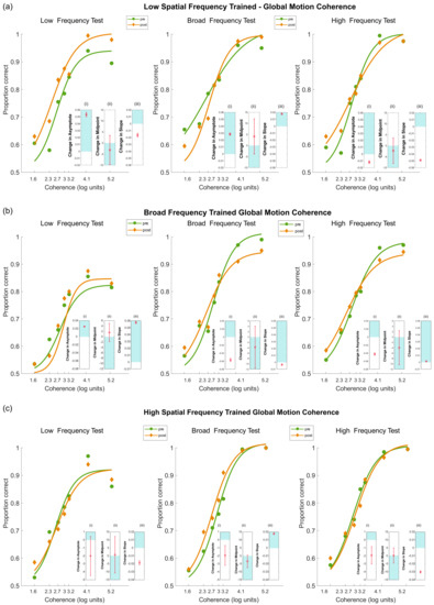 Results for the group trained with low-frequency stimuli are shown in Figure 9a. The model fits are summarised in Table 4. When tested with low-frequency stimuli, there was an increase in asymptote and a reduction in midpoint, but a reduction in slope. Overall, the results showed an improvement in performance, particularly at high coherence levels. When tested with broad frequency stimuli, there was an increase in asymptote and an increase in slope, but no change in midpoint. Again, these results showed an improvement in performance, most notably at high coherence levels. Finally, when tested with high-frequency stimuli, there was a reduction in asymptote, a reduction in slope and no change in midpoint. There was no improvement in the perception of motion coherence in this case, rather a slight reduction in performance.