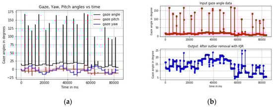 Figure 3. Outputs from using GazeVisual-Lib codes on eye gaze data (a) gaze angle, yaw, pitch values as a function of time (b) outliers removed from gaze data using IQR method.