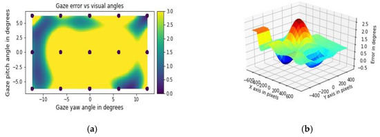 Outputs from using GazeVisual-Lib codes: (a) 2D surface distribution of gaze errors as a function of visual angles; (b) 3D plot of gaze errors as a function of display dimensions in pixels.