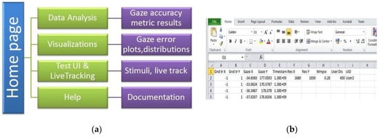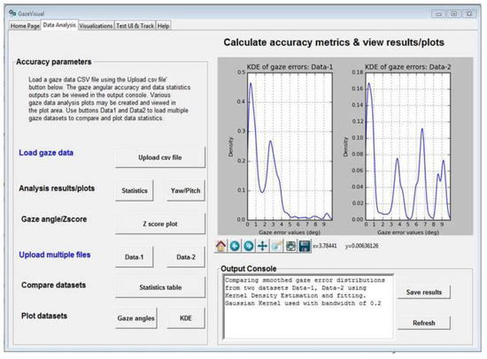 The GazeVisual software is comprised of four independent windows containing a range of functions incorporated in it that are aimed toward gaze data evaluation. Input data format for the GazeVisual software is shown in Figure 5b. It is comprised of columns for raw gaze and ground truth data coordinates and input variables like display screen resolution and pixel pitch of the display (µ) [8] and user distance from the tracker. Two sample gaze data files that can be input to the GazeVisual software are provided in the GitHub folder. The GazeVisual software can be compiled as a generic Python program/IPython Notebook to produce the GUI application. Following this, the input gaze data files can be uploaded to the software using the “Upload csv file” button, and then the rest of the software functionalities may be implemented using the other GUI buttons. Outputs of the software include gaze accuracy values, error statistics, plots of error numerical and spatial distributions, and comparison of two gaze datasets [14].