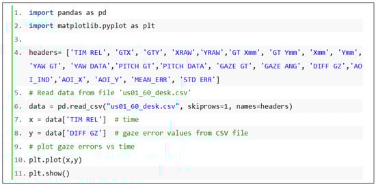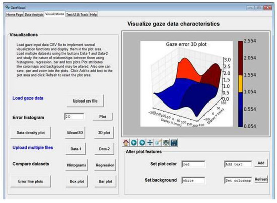 The GazeVisual GUI tool could be extended by gaze researchers in various ways. For example, in Figure 7, a single dataset is used to plot the figure, and the utility of this is to study gaze data characteristics from single person or experiments. However, functions for plotting the mean values of gaze errors and error patterns for different persons could be a valuable feature that could be added to the software in future. Although this feature is not present in the current version of GazeVisual, it is always possible to extend the software features to include more functions such as for uploading multiple datasets, numerical functions e.g., for data filtering and outlier removal. Also, common APIs could be developed to interface the GUI will multiple eye trackers. This is the utility of making the software and codes open resources that are freely available for modification.