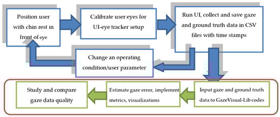 Gaze data quality refers to the validity of the gaze data measured and reported by an eye tracker [1]. The most common method of representing gaze data quality is by specifying gaze estimation accuracy, which refers to the difference between the true and the measured gaze positions [2]. There currently exists significant diversity in gaze accuracy measures as described in reference [3], which leads to ambiguity in interpretation of the quality of gaze data from different eye tracking systems and difficulty in comparison of two or more eye trackers. Moreover, with the growing applications of gaze information in consumer devices like augmented and virtual reality, smartphones, and smart TVs [4,5,6,7] the eye trackers used in such applications need to be thoroughly evaluated to ensure the high quality and consistency of their gaze data outputs. This calls for the development and adoption of homogeneous metrics for reporting gaze accuracy and a consistent set of methods for complete characterization of eye trackers’ data under different operating conditions [8]. There are several software tools [9,10,11,12,13] that have been developed over the years by gaze researchers as well as eye tracker manufacturers for gaze data analysis. The general focus of these software is toward determining eye movement characteristics (i.e., fixations, scanpath, saccades) and studying eye movement relationships with human cognitive process, such as creation of attention maps, understanding regions of user interests, and visual search patterns. Also, a range of gaze datasets have been developed so far by gaze researchers, which are either aimed at building of new gaze estimation algorithms or toward cognitive studies, visual saliency research, and scanpath analysis. However, gaze datasets that contain gaze and ground truth data collected under different operating conditions of an eye tracker, from multiple user platforms, are not yet publicly available.