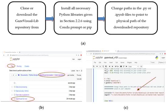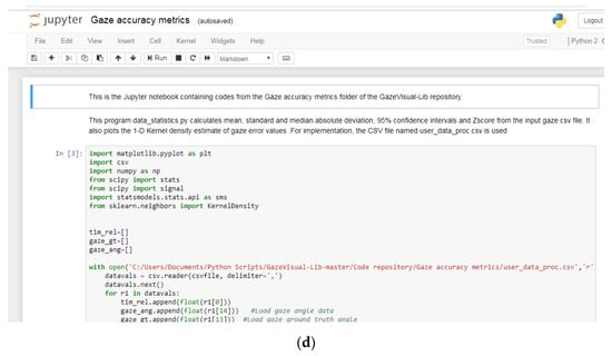 (a) Flowchart for running the GazeVisual-Lib codes. (b) Opening the Jupyter Dashboard to locate the downloaded GazeVisual-Lib folder. (c) Running the GazeVisual GUI code on Jupyter (arrow shows the paths which have to be changed). (d) View of the Jupyter notebook for the Gaze accuracy metrics folder.