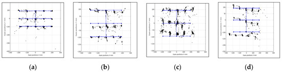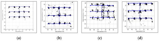 In Figure 11, Figure 12 and Figure 13, samples of eye gaze data overlapped on ground truth locations of the stimuli from each of these experiments are provided. Gaze data is in black and ground truth data are in blue. It is seen that data from different experiments look consistent but are affected by variable levels of outliers, which is why the outlier removal methods are provided in the GazeVisual-Lib repository. All these data, along with time stamps, were written in comma separated values (CSV) format for each user and each experiment session. Gaze data plots from multiple participants for the different operating conditions may be found in Appendix B of this paper.