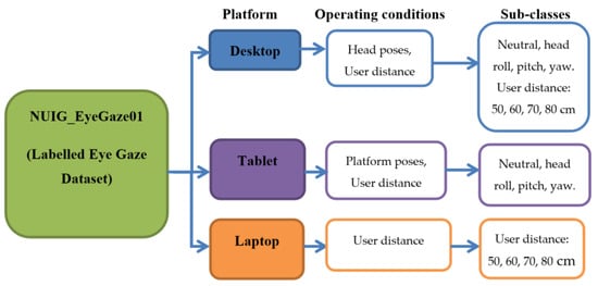 Considering these factors, a rich and diverse gaze dataset, using the eye tracking data collected through dedicated eye tracking experiments conducted under wide range of operating conditions, is therefore built and presented in an open data repository. The dataset is named NUIG_EyeGaze01 (Labelled eye gaze dataset) and is hosted in the Mendeley open data repository with the doi:10.17632/cfm4d9y7bh.1. The link to the dataset is provided in Section 1.2. This is a new kind of gaze data set, collected from three user platforms (desktop, laptop, tablet) under the influence of one condition at a time. Using this dataset, the impact of different operating conditions may be observed and quantitatively compared. The conditions include fifteen different head poses, four user distances, nine different platform poses, and three display screen size and resolutions. Each gaze data file is labelled with the type of operating conditions under which it was collected.