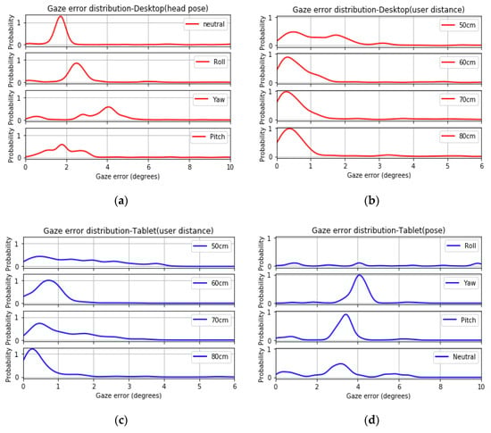 Gaze error distribution due to (a) user distance–desktop, (b) head pose–desktop, (c) user distance–tablet, and (d) platform pose–tablet.