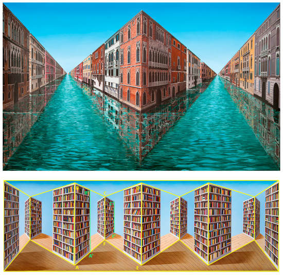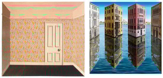 - Wade, N.J.; Hughes, P. Fooling the eyes: Trompe l’oeil and reverse perspective. Perception 1999, 28, 11151119. [Google Scholar] [CrossRef]