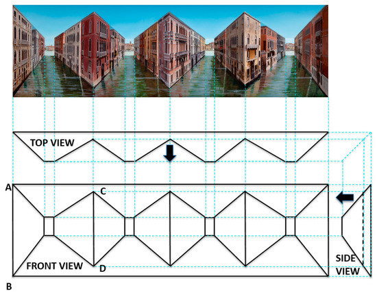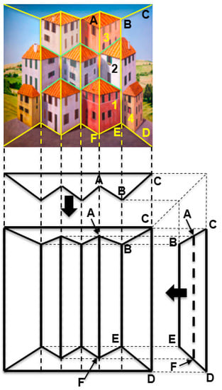 By contrast, Patrick Hughes has invented another technique that places both forced- and reverse-perspective objects at the same distance from the observer. Impressively, this technique allows the third class of planar-perspective objects to also be embedded in the same art piece. A concrete example of this technique is shown by “Poetry in Motion” (2012) in Figure 6. The top panel shows the front view of the painted piece. The three panels at the bottom show orthographic views to illustrate the geometry. Yellow lines have been superimposed on the top panel to indicate physical edges. Light green lines indicate painted—not physical—edges that denote house boundaries. These lines, together with the orthographic views, make it clear that the piece is composed of three “truncated prisms”, such as the one labeled ABCDEF, with their flat faces lying in the back and their sharp edge jutting toward the viewer.
