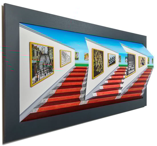 Left panel: “Sticking-out Room” (1964). It must be pointed that this “room” scene is painted on a 3D truncated pyramid that juts toward the viewer. Specifically, what appears to be the far wall with a door is physically closer to the viewer than the outer edges of the floor, walls, and ceiling. Right panel: “Real Reflections” (2017).