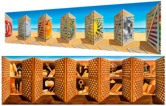 3) Assigning the role of “figure” to concave parts: This is evident in both the complex pieces of Figure 1 and Figure 2. Specifically from a pictorial point of view, the Venetian buildings form the “figure” against the “ground” of the surrounding water and the sky. It so happens—or is deliberately designed by the second author—that these buildings are painted on concave surfaces. Since viewers’ attention is drawn to the figure and since these figures are concave, the convexity bias acts to invert the perceived depth and strengthen the illusion, due to the superiority of figure parts over shapeless ground. This last factor is powerfully present in “Crate Expectations” (2018) in Figure 4, where the crates stand out as figures but not as potent in “A Study of the Studiolo” (2013) in the same figure, where the doors have a weaker role as figures, because they are juxtaposed with equally elaborate pictorial surroundings.