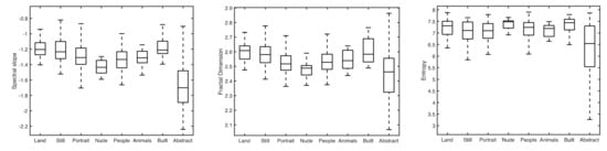 The diversity of the relationships between image statistics and aesthetic ratings across genres suggests that either: (i) different genres vary in their image statistics, and this variation determines which statistics are most relevant for ratings; or (ii) different statistical characteristics are relevant to ratings of different kinds of scene. In order to evaluate the first explanation, statistical analyses were performed on the image statistics for different genres. Figure 1 shows boxplots of the luminance statistics of different genres for spectral slope (left-most graph), fractal dimension (middle graph) and entropy (right-hand graph). The central line in each box marks the median value, and the bottom and top edges of the box indicate the 25th and 75th percentiles respectively. The whiskers extend to the most extreme data points not considered to be outliers. Distributions of colour plane statistics were similar to the luminance statistics shown.