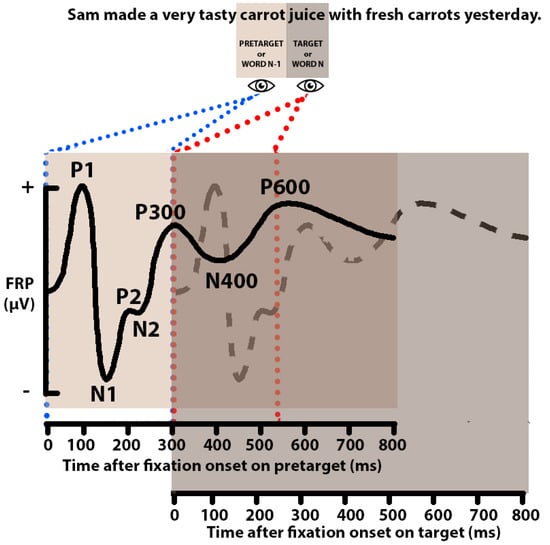 - Dambacher, M.; Kliegl, R. Synchronizing timelines: Relations between fixation durations and N400 amplitudes during sentence reading. Brain Res. 2007, 1155, 147–162. [Google Scholar] [CrossRef][Green Version]