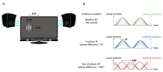 (A) Experimental set-up, including an illustration of a sample visual target displayed to the left of screen center. (B) An illustration of the modulation in visual contrast for a single visual stimulus (black/grey line) and the range in modulation of auditory loudness (baseline condition: green; in-phase condition: blue; out-of-phase condition: red) across time.