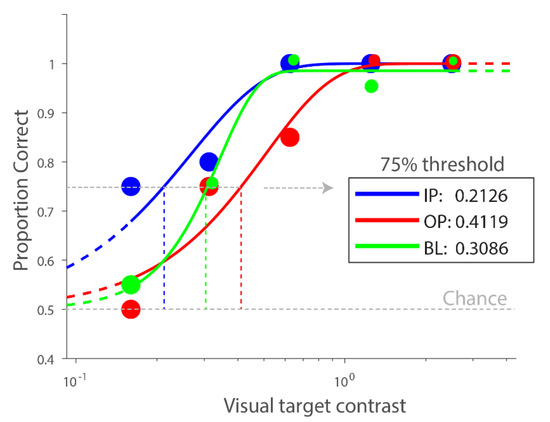 Psychometric functions of baseline (BL), in-phase (IP) (mid-salience), and out-of-phase (OP) (mid-salience) conditions from a representative participant showing the expected effect: estimated visual contrast threshold is the lowest for IP, then BL, then OP condition. The size of individual dots is adjusted so that overlapping data points are more visible.