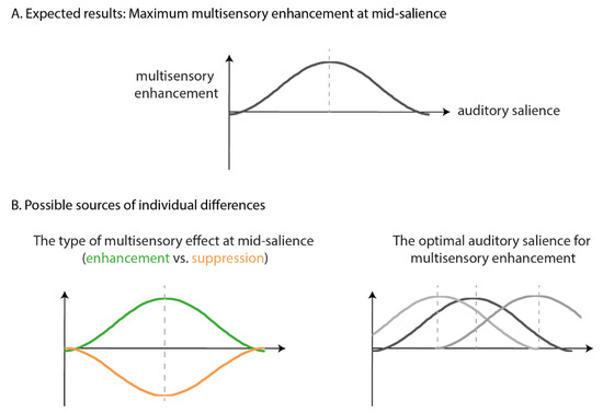 (A) Illustration of hypothetical data showing the expected results where multisensory enhancement peaks at mid-auditory salience, reflecting the interaction between temporal phase coherence and auditory salience. (B) Illustration of possible sources of individual differences which could arise from the type of multisensory effects, enhancement or suppression, at mid-auditory salience (left), or the optimal auditory salience required for multisensory enhancement (right).