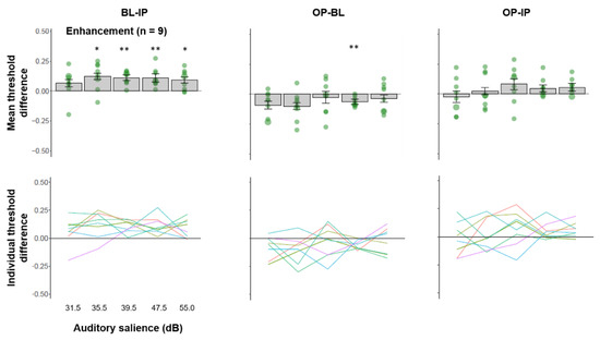 We plotted the average threshold difference across multisensory comparisons for participants who showed an enhanced visual contrast threshold for mid-salience IP sounds relative to BL in Figure 4 (top panel). We observed a significant facilitative effect of IP sound relative to BL in four of the five auditory salience levels (except the softest level), FDR-adjusted ps < 0.0124, despite the grouping being based on only the mid-level salience (39.5 dB). This suggests, for this group of participants, IP sounds enhanced performance regardless of auditory salience levels. This group of participants also showed a significant benefit of OP sound relative to BL at an adjacent auditory salience level (47.5 dB) (t(8) = 4.838, FDR-adjusted p = 0.006, Hedges’ g = 0.569, 95% CI (−0.450, 1.589)). We did not find any effect of OP vs. IP after adjusting for multiple comparisons. Individual trend lines of threshold differences as a function of auditory salience (Figure 4, bottom panel) showed that the facilitative effect of IP sound relative BL is relatively consistent across salience levels and individuals, whereas the other comparisons are variable across individuals.