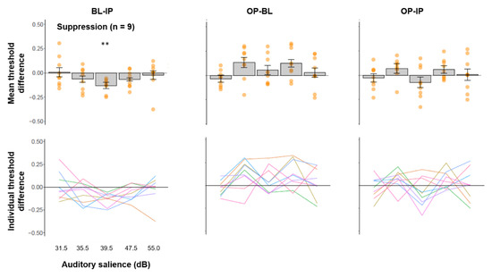 (Top panel) Mean threshold difference (+/− SE) and (bottom panel) trends line for individual participants across three comparisons from the suppression group. **: p < 0.01.