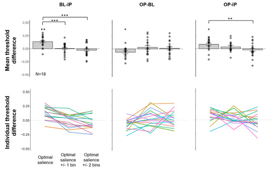 The mean threshold difference across participants is plotted in Figure 6 (top panel). We found a significant benefit of IP relative to BL at the optimal salience level (mean threshold difference = 0.135, 95% CI (0.086, 0.184), t(17) = 5.3921, FDR-adjusted p = 0.002, Hedges’ g = 1.243). This IP benefit relative to BL is not present at other salience bins (FDR-adjusted ps ≥ 0.555). This is further confirmed by a significant main effect of salience on the magnitude of BL-IP threshold differences, (F(2, 34) = 22.157, p < 0.001, ƞ2G = 0.281). Post-hoc analysis revealed that the BL-IP threshold difference at the optimal salience is significantly greater than that of optimal salience +/− 1 bin, (FDR-adjusted p < 0.001), and that of optimal salience +/−2 bins (FDR-adjusted p < 0.001). The magnitude difference between optimal salience +/− 1 bin and +/− 2 bins is not significant (FDR-adjusted p = 0.18).