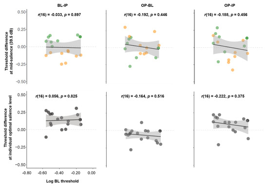 Correlation of log BL threshold against threshold differences (BL-IP, OP-BL, and OP-IP) at mid-salience levels (39.5 dB, top panel) and at optimal salience levels (bottom panel).