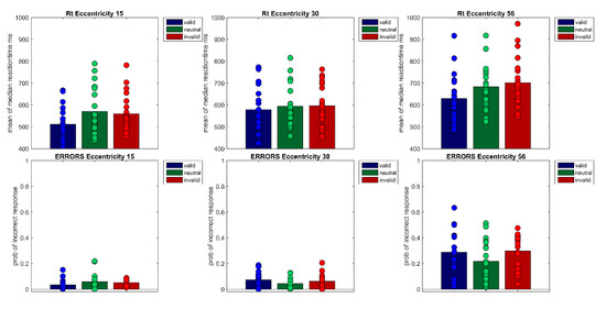 The figure shows the correct reaction times of Experiment 2 per Eccentricity (15°, 35°, 56°) × Cueing (valid, neutral, invalid). Bars show the mean of median reaction times across participants. Filled circles show the medians of each individual participant (upper row). The lower row shows the probabilities of incorrect responses for each of the nine conditions. Bars denote the mean probability across participants, filled circles the probabilities of each participant.