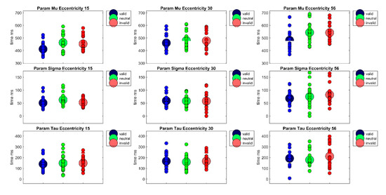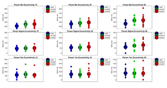 The figure shows the parameters of the ex-Gauss-fit (μ, σ, τ) for each Eccentricity (15°, 30°, 56°) × Cueing (valid, neutral, invalid) condition. Large circles show the condition mean and small circles show the values of each individual participant.