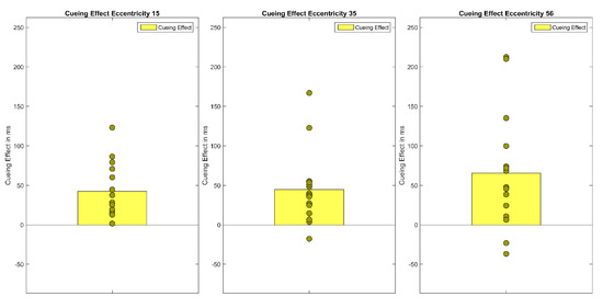 The figure shows the cueing effects (invalid RT-valid RT) for each eccentricity (15°, 30°, 56°). Bars show the mean of cueing effects across participants. Filled circles show the cueing effects of each individual participant.