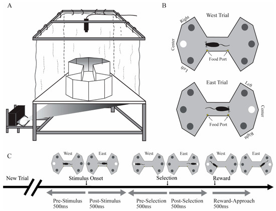 Figure 1A). The apparatus has a clear Plexiglas subfloor (147.32 cm × 111.80 cm and 1.25 cm thick) covered by Dual Vision Fabric (Da-Lite Screen Company, Warsaw, IN), a unity gain flexible fabric designed for rear screen projection. A thin Plexiglas sheet (0.32 cm) covered the fabric for protection. Visual stimuli were projected onto the unity gain fabric from below the subfloor using an LCD projector (WT610 projector, NEC Corporation). In this experiment, the enclosure was a bowtie-shaped arena for the presentation of stimuli. Food reward (milk with various flavors) was delivered by two automated pumps (Med Associates, Inc., St. Albans, VT, USA) to stainless steel food ports located at the middle region of the maze. Auditory stimuli were controlled by an automated auditory stimulus generator (ANL926, Med Associates, Inc.) and delivered through a speaker located above the maze.