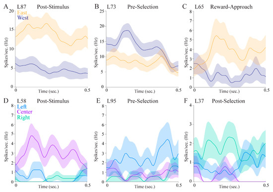 Figure 5, compare upper panels to lower panels). This may have to do with the particular epochs in which cells tended to show location correlates. Allocentric cells were more likely to show selectivity in the post-stimulus epoch immediately after stimulus onset, when the rat was in the center of the maze facing the fan-shaped part of the maze where stimuli appear on either the east or the west side. In contrast, egocentric cells were more likely to be selective in the epoch after a choice was made, when the animal was physically located in the left, center, or right in one or the other of the fan-shaped parts of the maze. This suggests that allocentric cells may be more sensitive to visual information, whereas egocentric cells may be more sensitive to spatial information. Alternatively, the egocentric cells could show lesser differences across conditions because they are more likely to show mixed selectivity given that three locations are analyzed. Indeed, the cell shown in